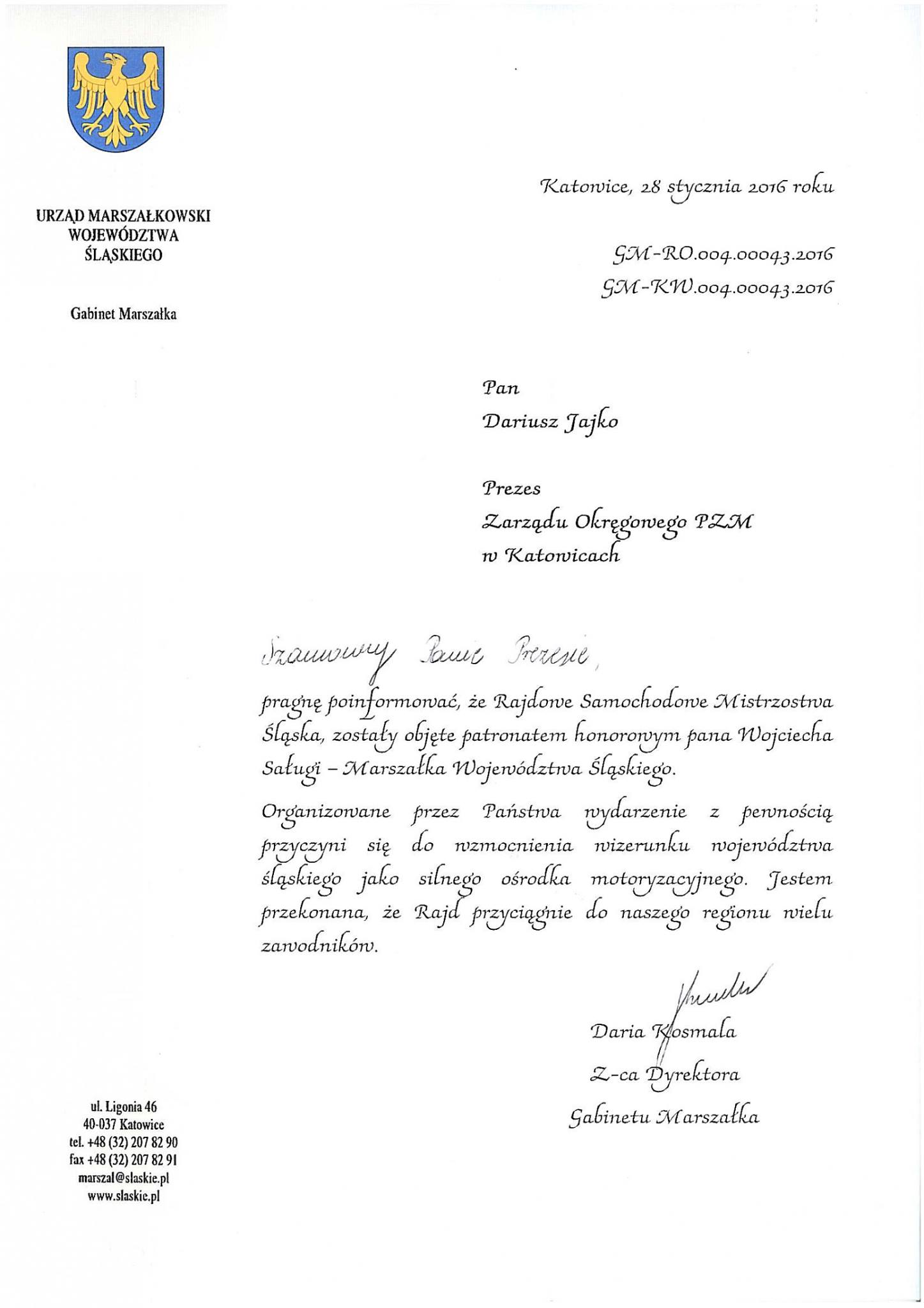 Z wielką przyjemnością informujemy, że Rajdowe Samochodowe Mistrzostwa Śląska 2016 zostały objęte patronatem honorowym Pana Wojciecha Saługi – Marszałka Województwa Śląskiego.